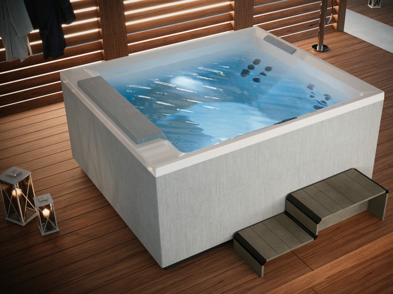 Wanne mit zwei Tiefen, einer Chaiselongue und zwei bequemen, gegenüberliegend angeordneten Sitzflächen. Die verschiedenen Hydromassage-Tools an jedem Sitzplatz garantieren kompromissloses Wohlbefinden. Ein Moment der vollkommenen Entspannung mit Cromolight- und Bluetooth-Audiosystem mit einklappbaren Boxen innen und außen.
