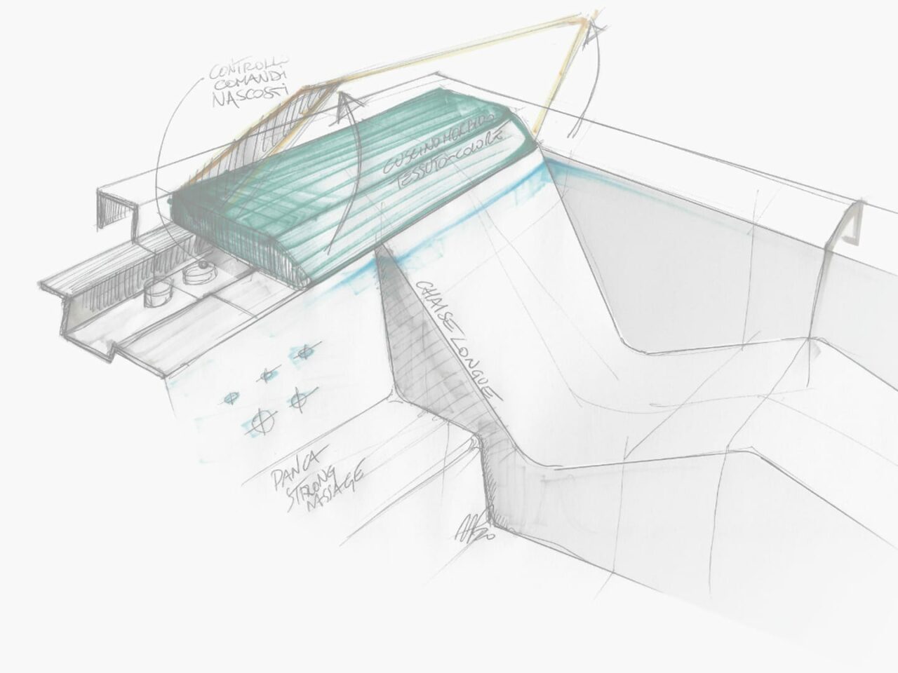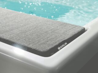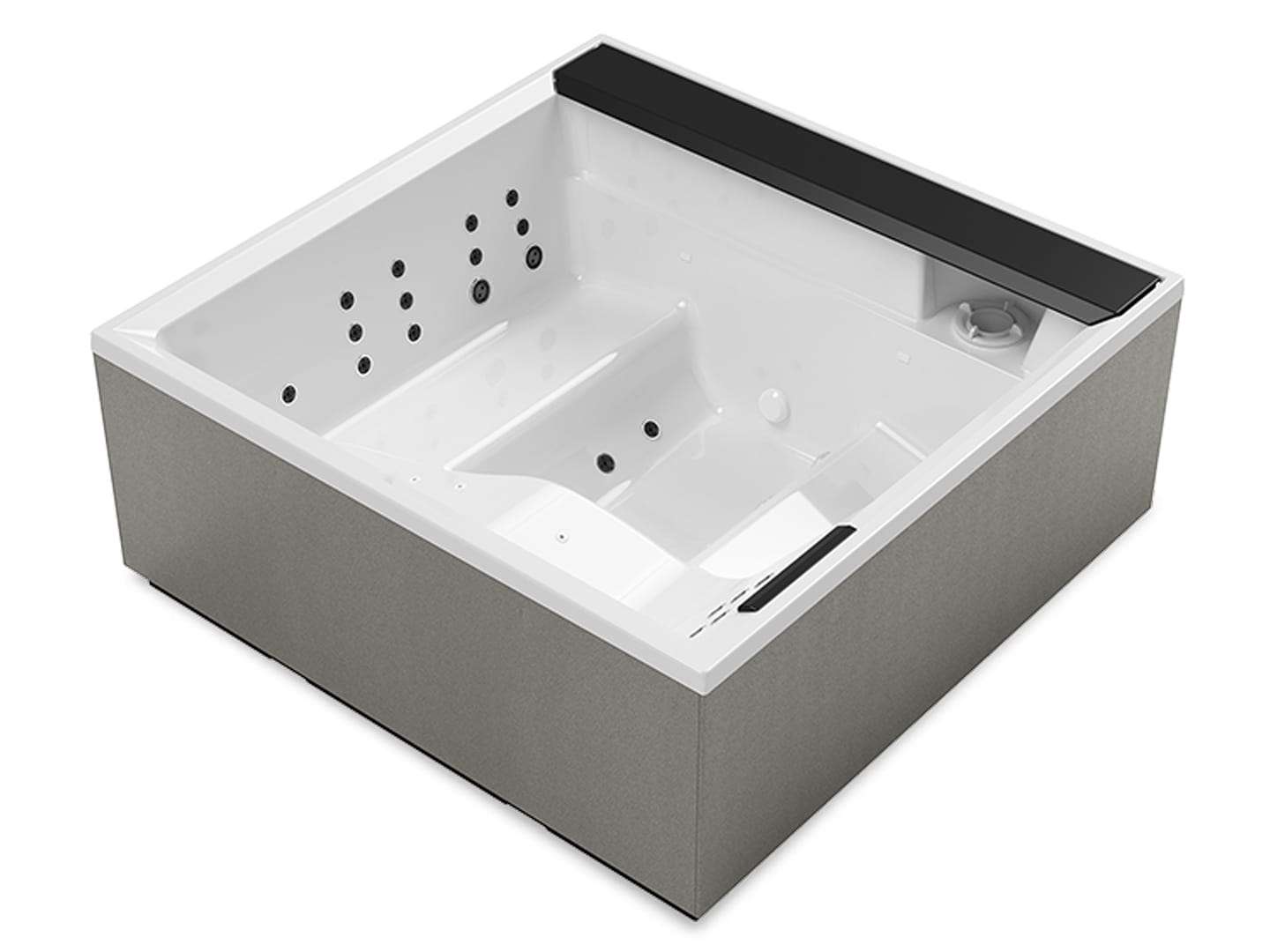 Wanne mit zwei Sitztiefen, einer Chaiselongue und 3 bequemen Einzelsitzflächen. Jeder Platz ist mit spezifischen Hydromassage-Düsen ausgestattet, die sich positiv auf die entsprechenden Körperregionen auswirken. Das praktische einklappbare Board sowie die Kopfstützen aus weichen Soft-Touch-Materialien sorgen für noch mehr Komfort bei der Nutzung der Wanne.