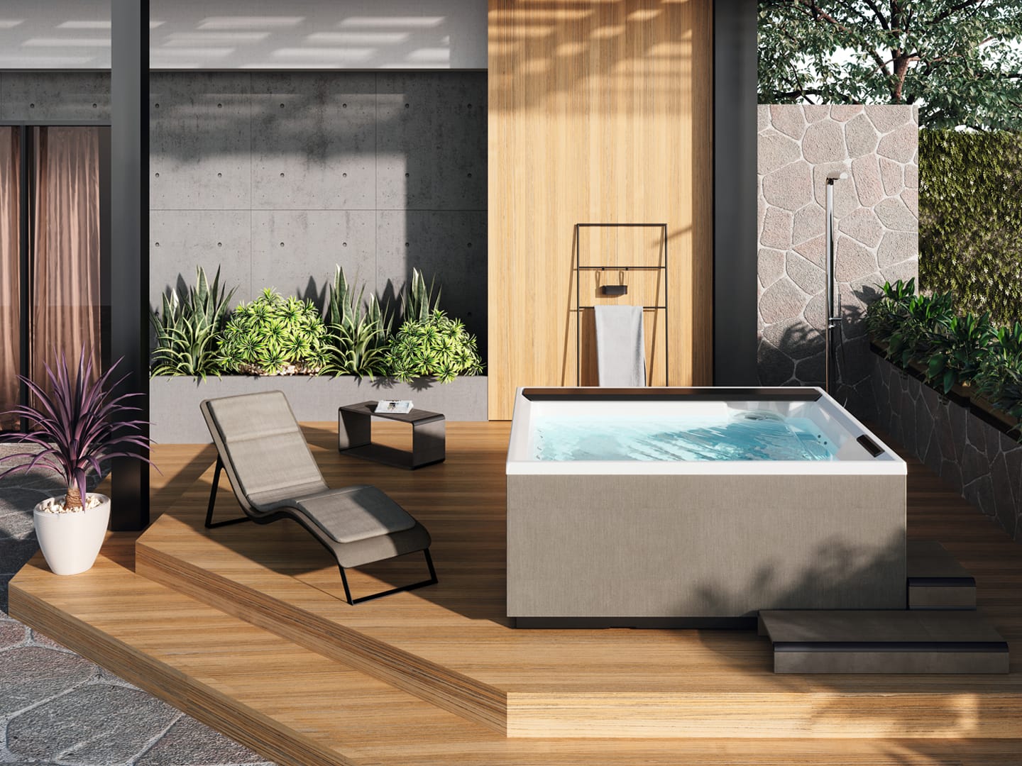 Jeder Platz im Whirlpool ist mit verschiedenen Hydromassage-Arten ausgestattet, die unterschiedlichste hydrotherapeutische Behandlungen für Wellness auf höchster Stufe bieten. Die Bluetooth-Audio- und Cromolight-Beleuchtungssysteme in den DIVINA SPA vervollständigen den Moment des holistischen Wohlbefindens. Der Desinfektionsvorgang Aquaclean mit Ozon und UV beseitigt hingegen sofort Bakterien, Viren und chlorresistente Mikroorganismen aus dem Wasser.Durch die Auswahl zwischen den Finishes Quarz und Oxid entstehen Outdoor-SPA-Produkte in neutralen und kalten oder in vorwiegend warmen und umhüllenden Farben. Wählen Sie Ihre ideale Kombination.